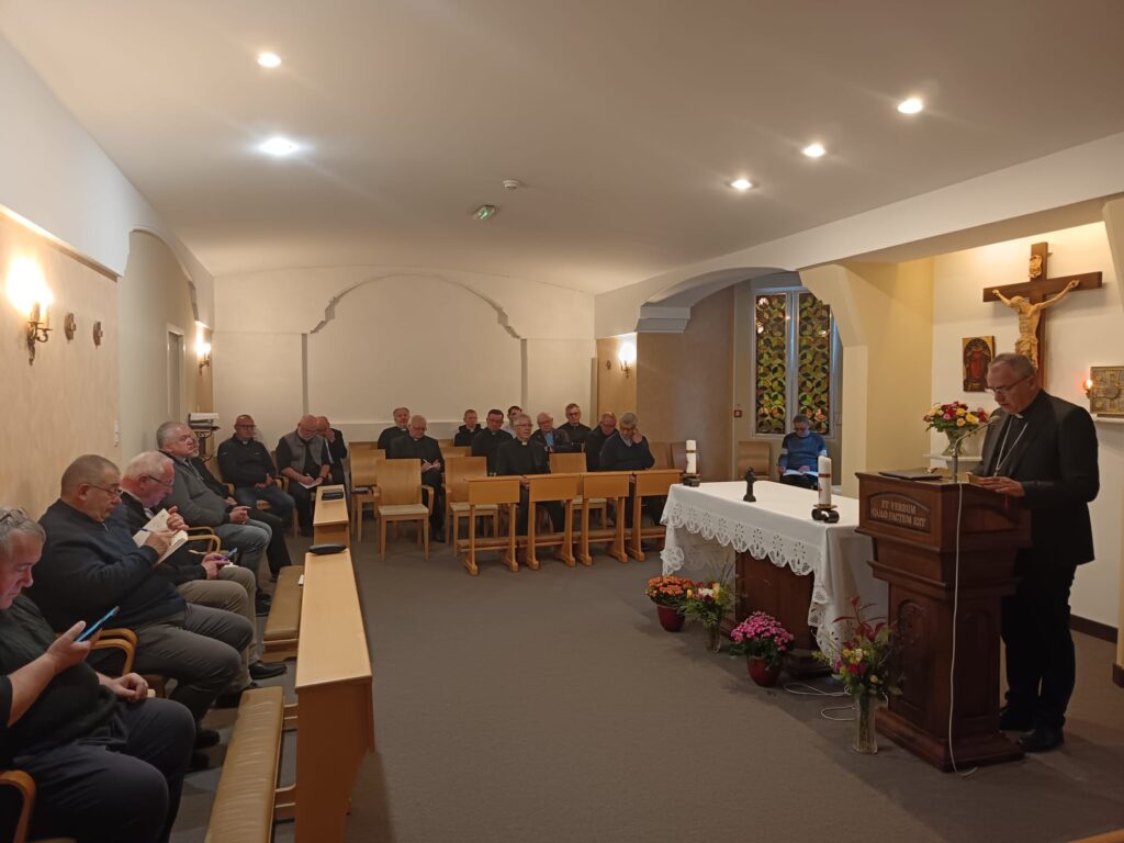 Po modlitwie porannej kapłani wysłuchali konferencji bp. Roberta Chrząszcza. „Warto odnawiać w sobie świadomość, że Bóg wybrał mnie z miłości” – mówił bp Chrząszcz. Zachęcił księży, aby wracali do momentu wyboru drogi powołania i cieszyli się owocami kapłańskiej posługi, choćby tymi po ludzku małymi. „Kapłaństwo to bycie rozpoznawalnym i dostępnym zawsze. Kapłan nie żyje w ukryciu, ludzie wiedzą kim jest” – dodał biskup rekolekcjonista.