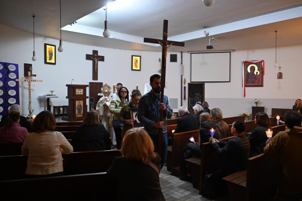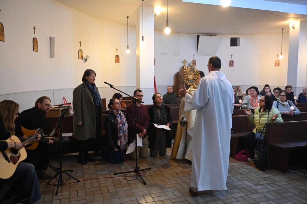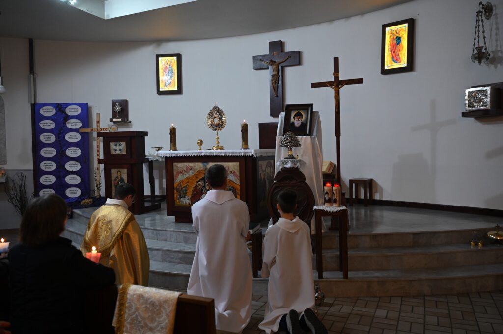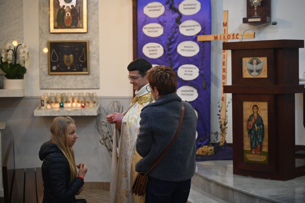 Po Mszy Świętej wierni pozostają na adoracji Najświętszego Sakramentu. To moment szczególny – czas ciszy, w której każdy może trwać przed Bogiem tak, jak potrafi. Niektórzy zamykają oczy, inni wpatrują się w monstrancję, jeszcze inni cicho modlą się, powierzając Bogu swoje życie.