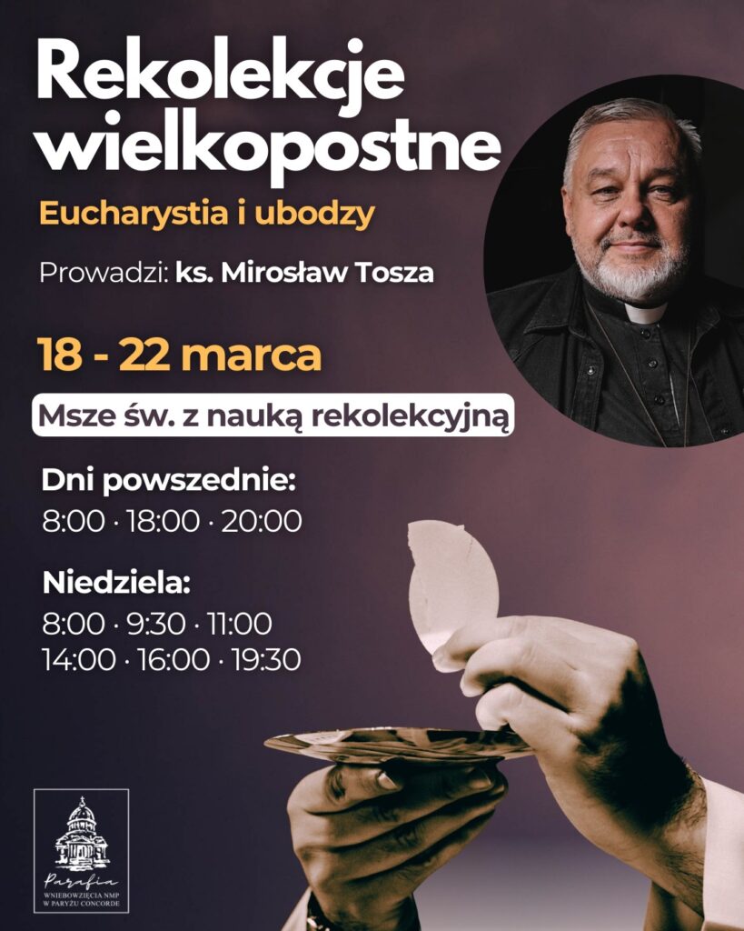 Trwają rekolekcje wielkopostne w parafii pw. Wniebowzięcia NMP na „Concorde” w Paryżu (263 Rue Saint-Honoré, 75001 Paryż). Prowadzi je ks. Mirosław Tosza. Msze św. o godz. 18:00 są transmitowane na parafialnym kanale YouTube.