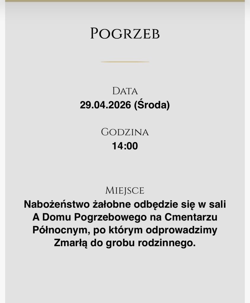 Pogrzeb odbędzie się tego samego dnia w Polsce o godz. 14:00.