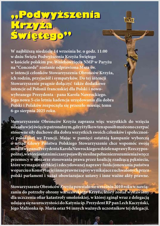 Prezes Maria Jolanta Dźwigała i Stowarzyszenie Obrońców Krzyża zapraszają do wspólnej modlitwy w intencji członków Stowarzyszenia oraz za Polskę i prezydenta Karola Nawrockiego. Okolicznościowa Msza św. odbędzie się w niedzielę 14 września o godz. 11:00 w kościele polskim pw. Wniebowzięcia NMP na “Concorde” w Paryżu. Tego dnia przypada święto Podwyższenia Krzyża Świętego.