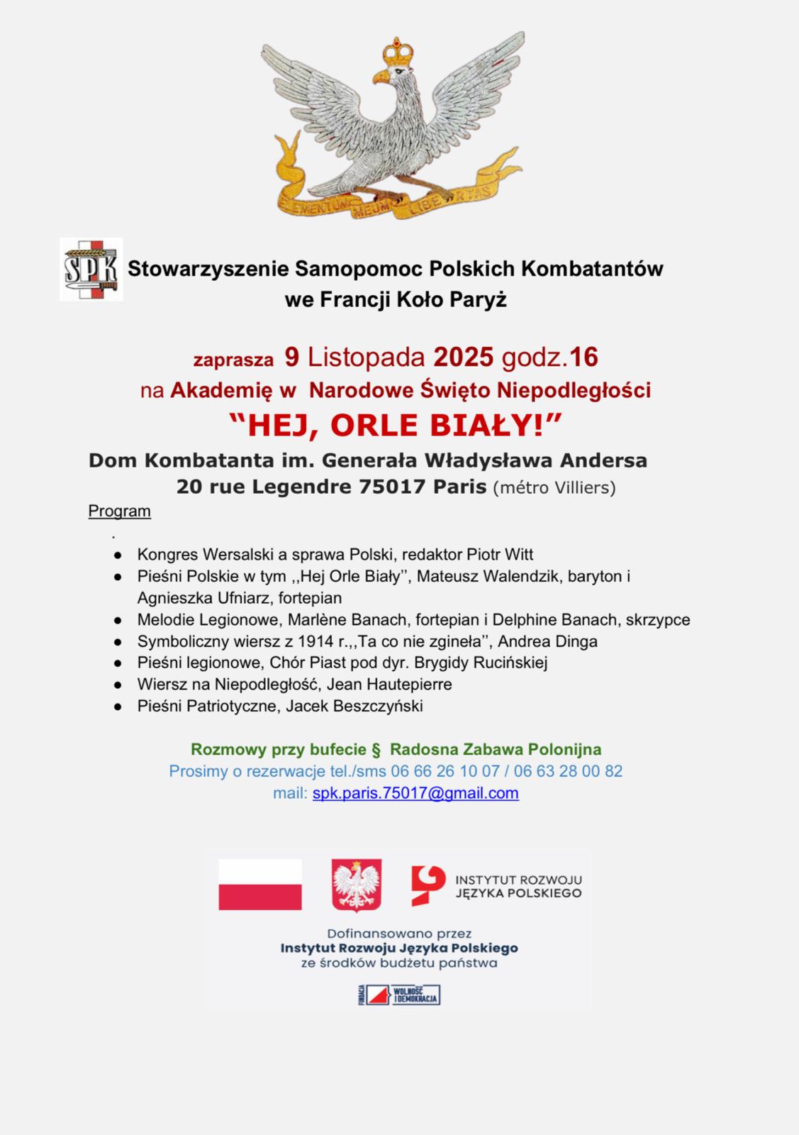 Stowarzyszenie Samopomoc Polskich Kombatantów we Francji Koło Paryż zaprasza 9 listopada na godz. 16:00 na Akademię „Hej, Orle Biały!” z okazji Narodowego Święta Niepodległości. Szczegółowe informacje poniżej.