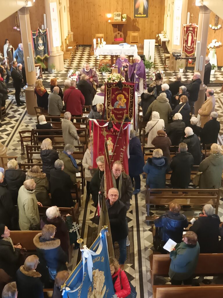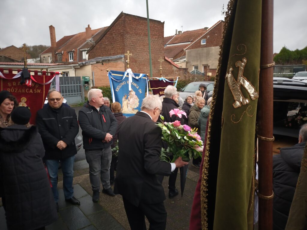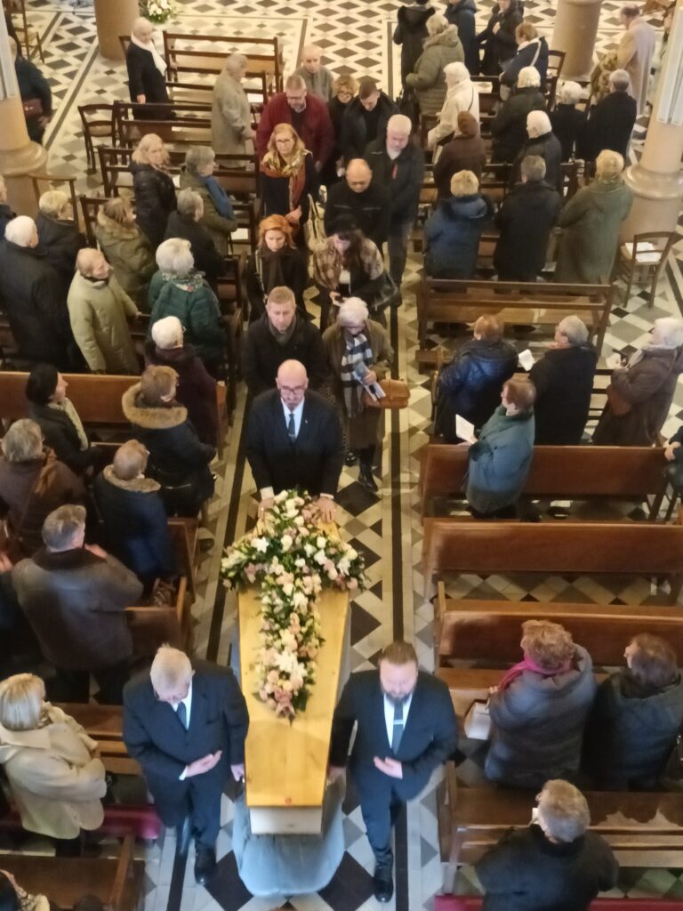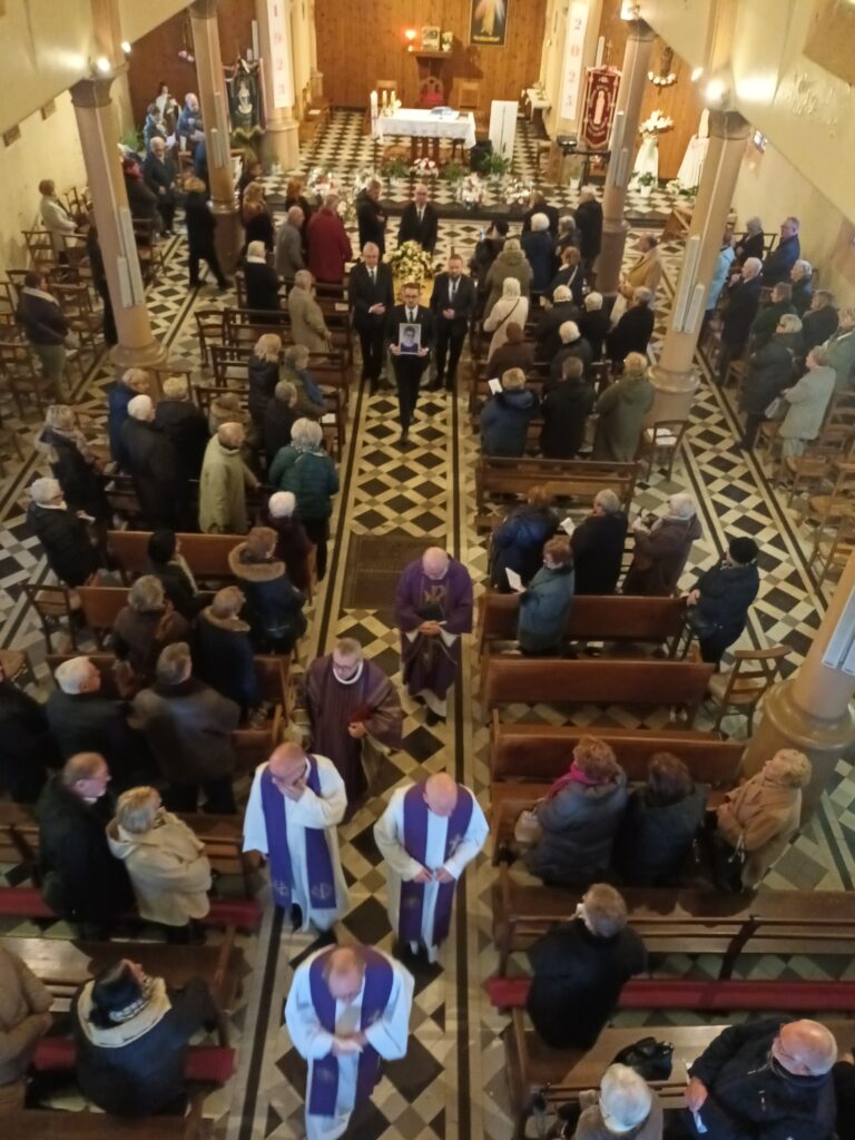 La lecture que nous venons d’entendre nous ouvre un chemin d’espérance. St Paul dans la première lecture, nous dit que « nous ne voulons pas vous laisser dans l’ignorance au sujet de ceux qui se sont endormi dans la mort, afin que vous ne soyez pas dans la tristesse comme les autres qui n’ont pas d’espérance ». Et Jésus, lui-même, nous rassure dans l’Evangile : « que votre cœur ne soit pas bouleversé, vous croyez en Dieu, croyez aussi en moi, dans la maison de mon Père, il y a de nombreuses demeures. » Ces paroles, sans doute, résonnent profondément aujourd’hui, et ne suppriment pas la peine, et n’éliminent pas les larmes, mais elles les traversent… et nous rappellent que la mort n’est pas une fin absurde mais un passage, un retour vers la maison du père. Kazimiera, nous le savons, était infirmière de formation. Toutefois, ce n’était pas seulement un métier pour elle, c’était une véritable vocation. Elle a consacré sa vie à prendre soin, à soutenir, à accompagner. D’abord son frère prêtre. Puis son mari malade, jusqu’au bout, avec une patience silencieuse, une fidélité admirable, une tendresse discrète. Elle portait dans son cœur cette capacité rare de servir sans bruit. Donner sans chercher à être vue. Elle portait la souffrance avec dignité, sans se plaindre, sans vouloir peser sur les autres. Cette force intérieure, cette pudeur dans la douleur, en disent beaucoup de la profondeur de sa vie spirituelle. Mais Kazia ne s’est pas enfermée dans un cercle privé. Elle voulait que sa vie soit une vie pour les autres. Et sa vie était largement ouverte sur l’église et sur la société. Elle était une figure connue et respectée dans la paroisse, dans la région et bien au-delà. Engagée dans la catéchèse des enfants, dans le groupe du Rosaire, dans l’organisation des fêtes paroissiales nationales, elle était véritablement une pierre vivante de la Communauté. Présidente de l’Union Nationale des Associations Catholiques Polonaises en France, présidente de la Confrérie du Rosaire de Liévin, ancienne catéchiste, et bien d’autres… Autant de responsabilités qui témoignent non pas d’une quête de pouvoir mais d’un profond sens du service. Vraiment, elle a voulu que sa vie soit une vie consacrée aux autres. Et grâce à son engagement au sein du PZK, à son souci pour le développement de la pastorale catholique polonaise et française, elle a rayonné bien au-delà du Nord de la France. Elle a su unir des générations, des cultures, des langues dans une même foi, une même prière, un même amour pour l’église.