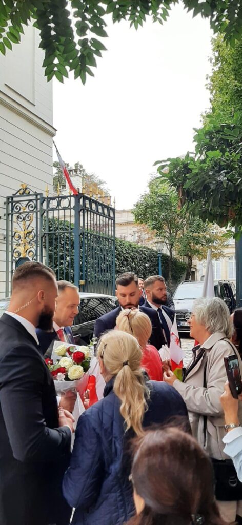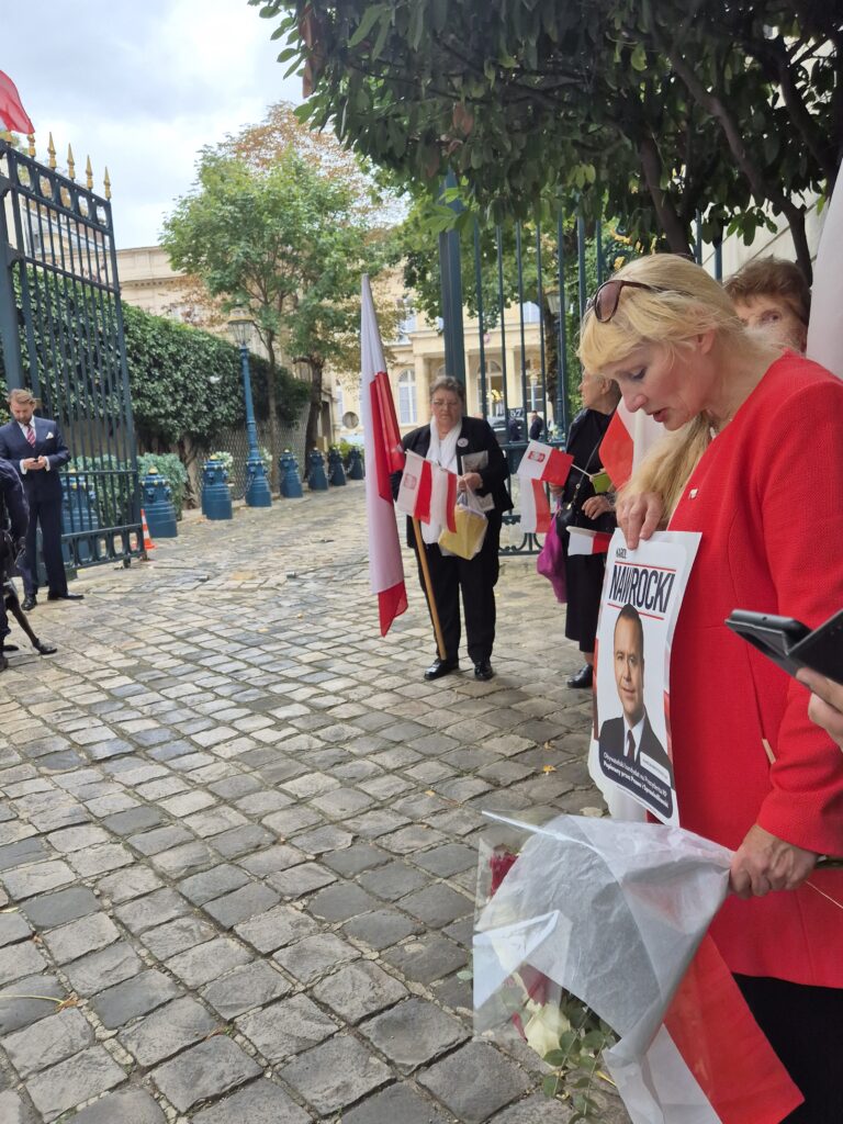 Otrzymałam informację od koleżanki ze stowarzyszenia, że Pan Prezydent Karol Nawrocki będzie na spotkaniu z mediami w Ambasadzie RP o godz. 17:30 i że ona się wybiera pod Ambasadę RP, żeby spotkać się z nim. Zdecydowałam się i ja pójść pod Ambasadę, lecz przed wyjściem postanowiłam podzwonić po członkach stowarzyszenia i znajomych, i zachęcić wszystkich, jeżeli mogą, to żeby też przyszli. Udało mi się zachęcić kilka osób, ponieważ większość członków stowarzyszenia pracowała. Wszystkich informowałam, żeby nie patrzyli na podaną godzinę, tylko przyszli wcześniej, jeśli mogą.