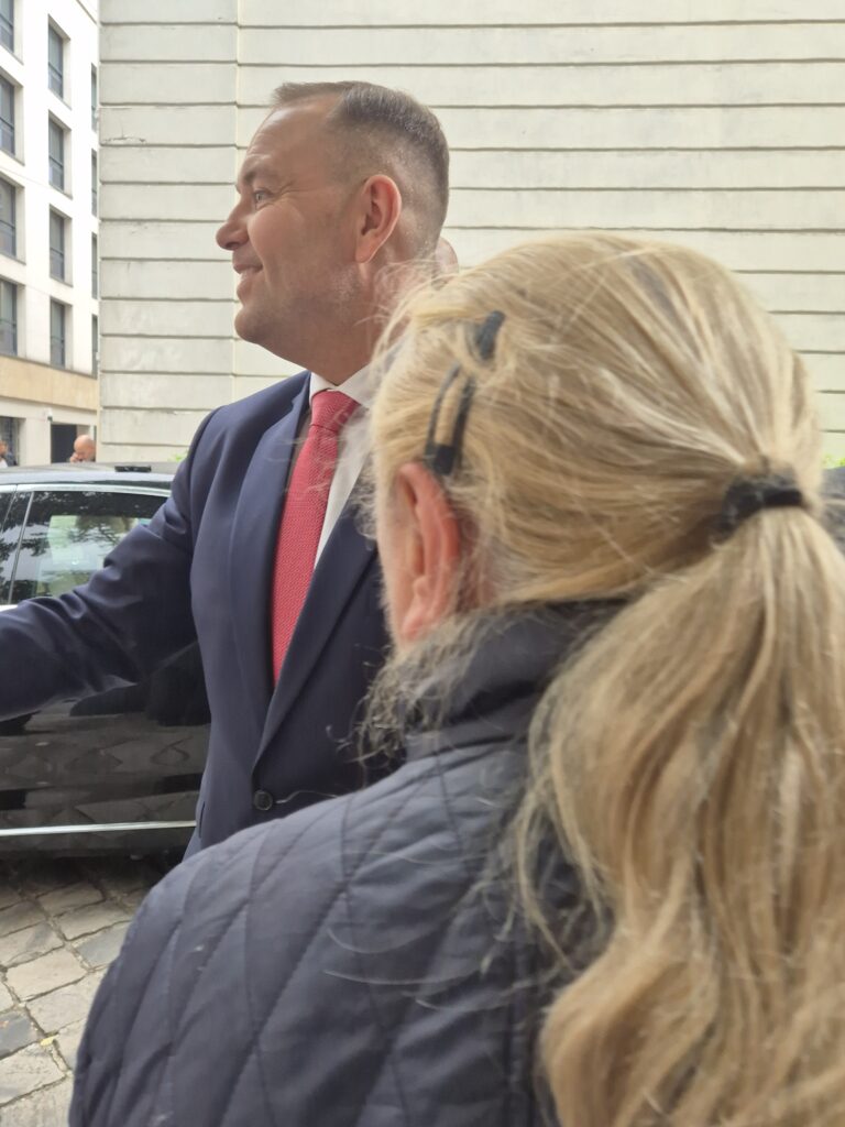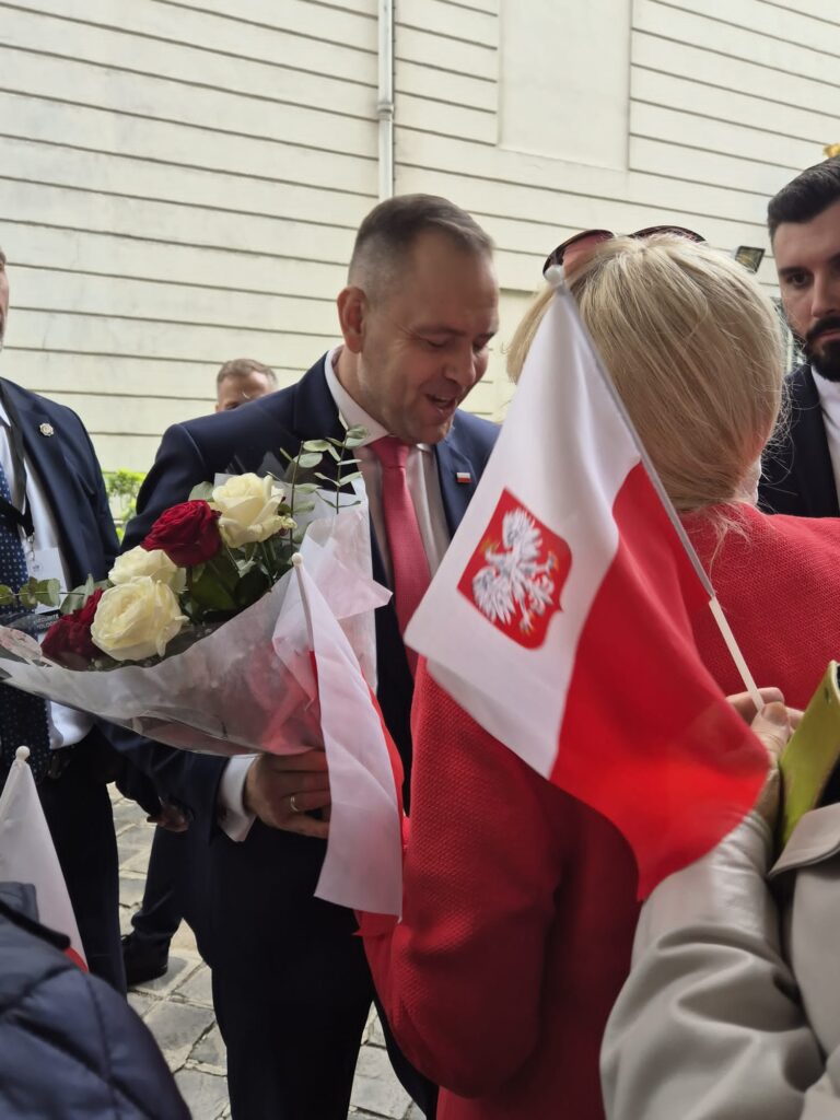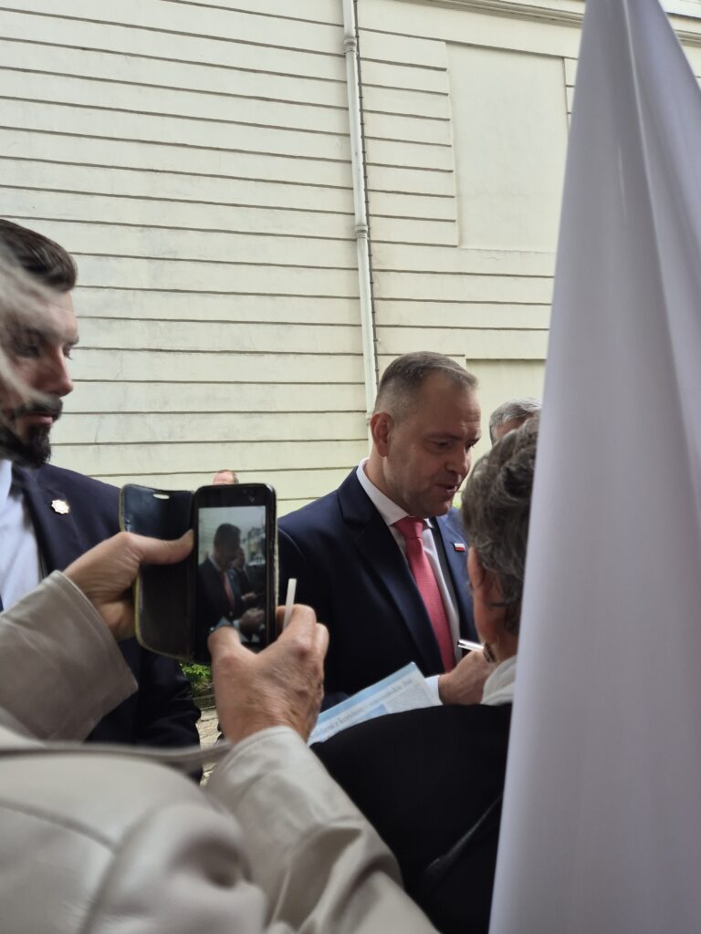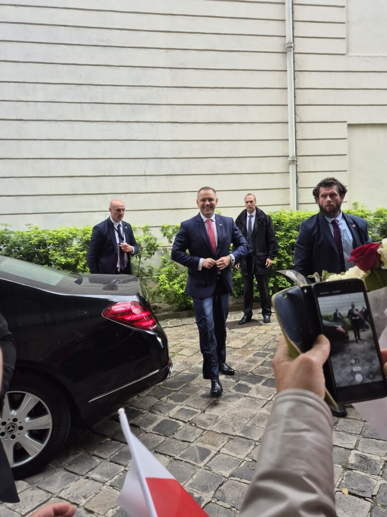 Oczekując, prowadziliśmy ożywioną rozmowę; nie zauważyliśmy, że w wyjeżdzających samochodach sprzed Ambasady był Pan Prezydent. Zauważyliśmy dopiero jak zatrzymał się na naszej wysokości i wysiadł. Podszedł do nas. Byliśmy zdziwieni i zaskoczeni, bo oczekiwaliśmy na niego, że przyjedzie do Ambasady na godz. 17.30, tak jak podano. Zmieniony został program, o czym nie widzieliśmy. Mieliśmy szczęście, że przyszliśmy wcześniej. Pan Prezydent, mimo że bardzo się spieszył, bo jechał na spotkanie z Prezydentem Francji Macronem podszedł do każdego, podał rękę, porozmawiał, podziękował nam za przybycie i głosowanie na niego. Wszyscy nasi rodacy, którzy przybyli i spotkali się z głową państwa polskiego, byli bardzo szczęśliwi. Zebrał się elektorat PiS i zwolennicy Prezydenta Nawrockiego.